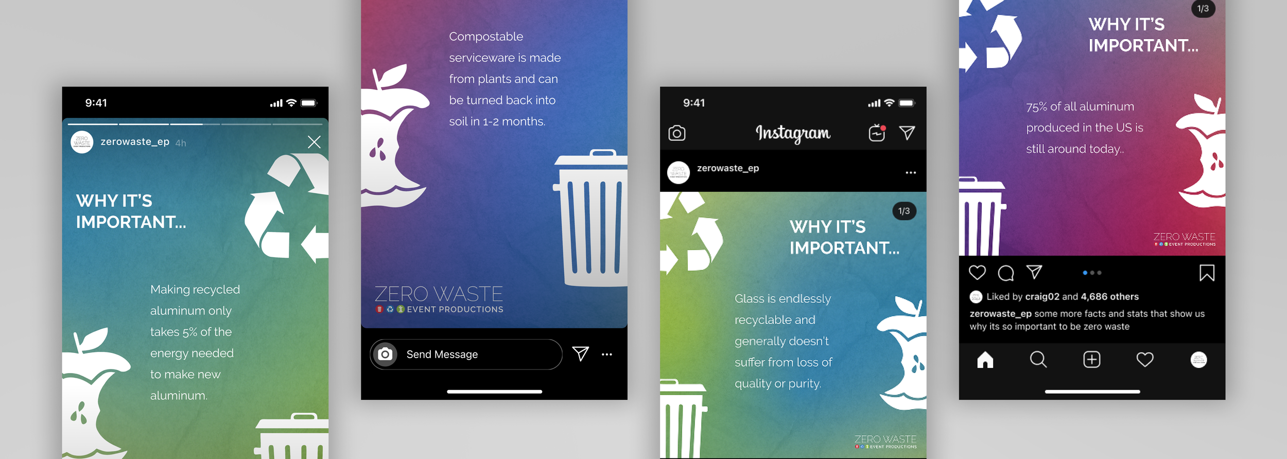 Social media packages done for a zero-waste event company. Graphics for their Instagram that highlighted the company's achievements and ways to contribute to the brand’s overall goal of zero waste at all levels. As well as a consulting booklet they will give to potential clients.